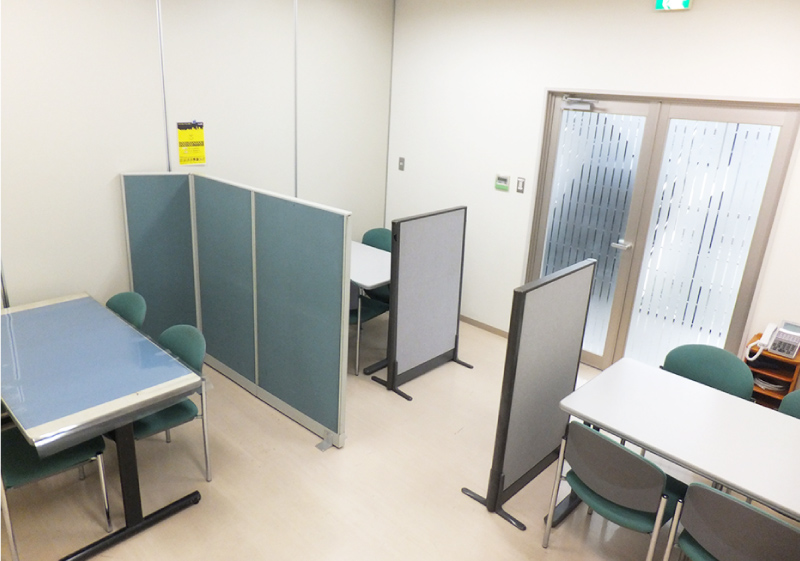 この部屋に3ブースの面談スペースがあり、いつも満室です。